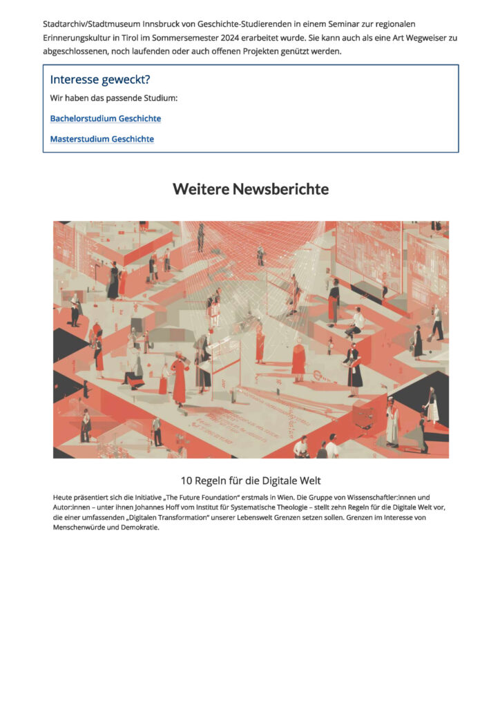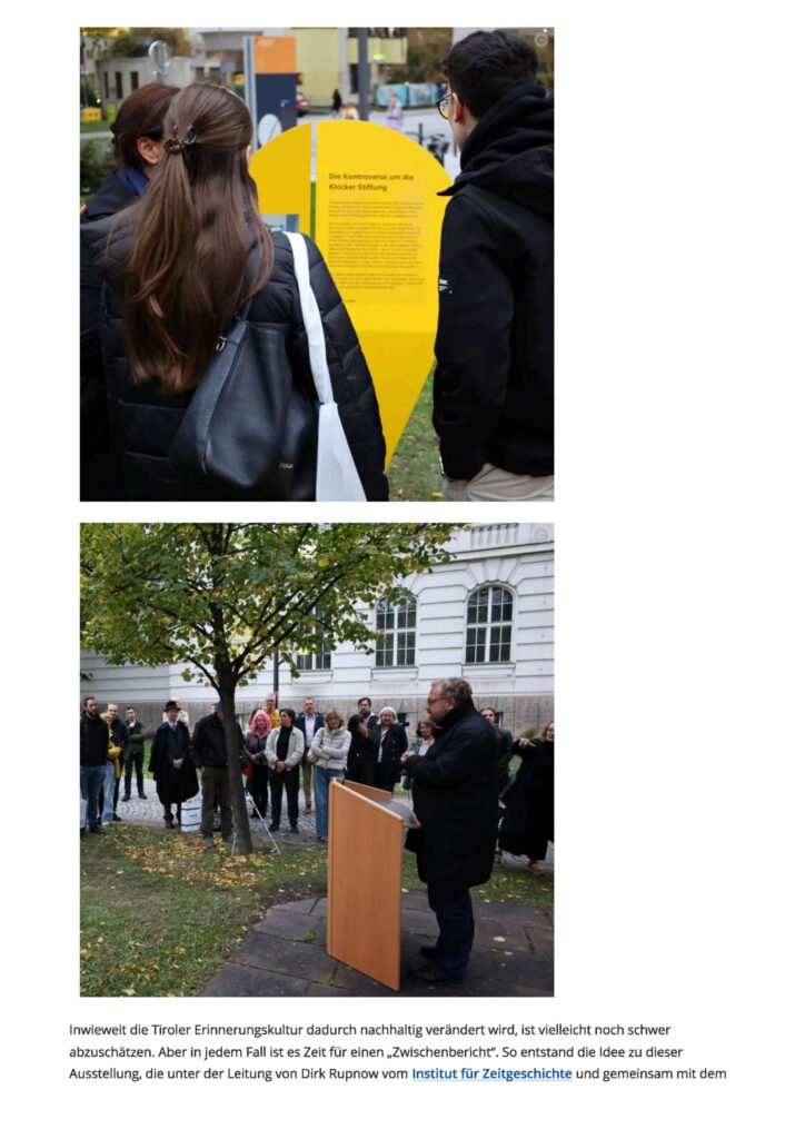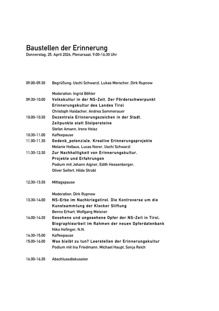 Inwieweit die Tiroler Erinnerungskultur dadurch nachhaltig verändert wird, ist vielleicht noch schwer abzuschätzen. Aber in jedem Fall ist es Zeit für einen „Zwischenbericht“. So entstand die Idee zu dieser Ausstellung, die gemeinsam mit Geschichte-Studierenden in einem Seminar zur regionalen Erinnerungskultur in Tirol (Sommersemester 2024) erarbeitet wurde. Sie kann auch als eine Art Wegweiser zu abgeschlossenen, noch laufenden oder auch offenen Projekten genützt werden.