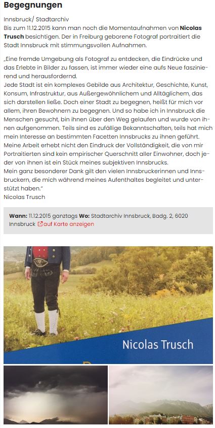 Eine fremde Umgebung als Fotograf zu entdecken, die Eindrücke und das Erlebte in Bilder zu fassen, ist immer wieder aufs Neue faszinierend und herausfordernd. […] Jede Stadt ist ein komplexes Gebilde aus Architektur, Geschichte, Kunst, Konsum, Infrastruktur, aus Außergewöhnlichem und Alltäglichem, das sich darstellen ließe. Doch einer Stadt zu begegnen, heißt für mich vor allem, ihren Bewohnern zu begegnen. Und so habe ich in Innsbruck die Menschen gesucht, bin ihnen über den Weg gelaufen und wurde von ihnen aufgenommen. Teils sind es zufällige Bekanntschaften, teils hat mich mein Interesse an bestimmten Facetten Innsbrucks zu ihnen geführt. Meine Arbeit erhebt nicht den Anspruch der Vollständigkeit, die von mir Portraitierten sind kein empirischer Querschnitt aller Einwohner, doch jeder von ihnen ist ein Stück meines subjektiven Innsbrucks.