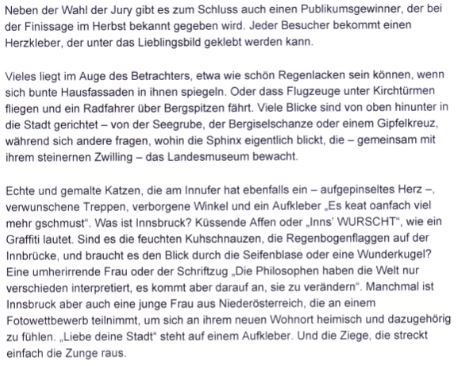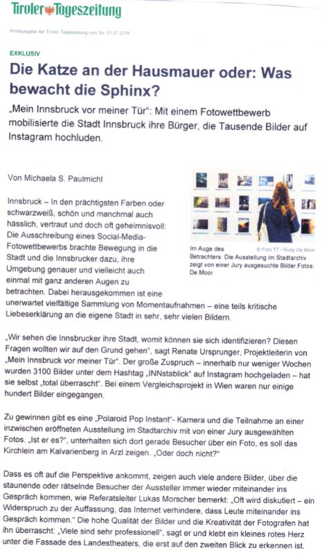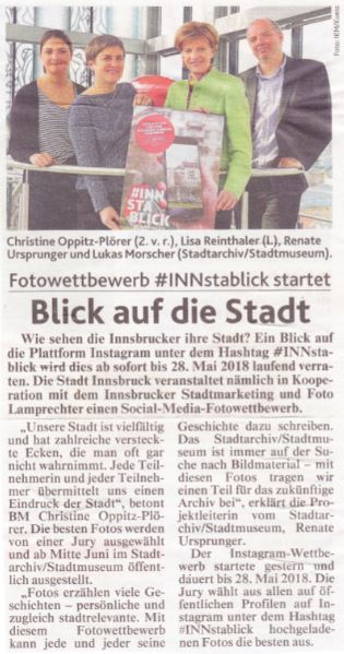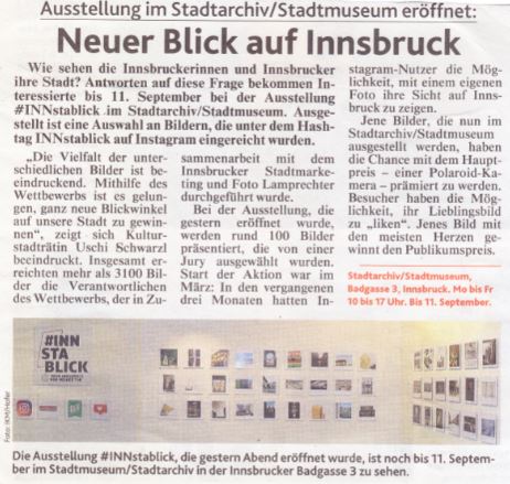 Wie sehen die InnsbruckerInnen ihre Stadt? Der Instagram Fotowettbewerb „#INNstablick. Mein Innsbruck vor meiner Tür“ hat dazu eingeladen, diesen persönlichen Blick festzuhalten. Eine Auswahl aus der Vielfalt wurde in der Ausstellung gezeigt. Aus über 3.100 Beiträgen wählte eine Jury 104 Fotos aus, die im Stadtarchiv/Stadtmuseum Innsbruck zu sehen waren.