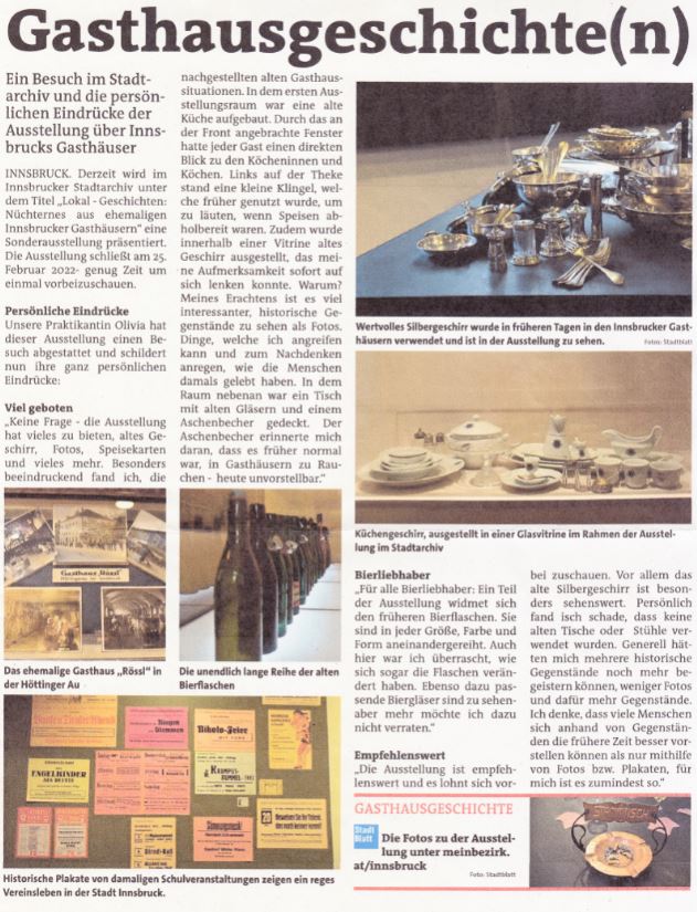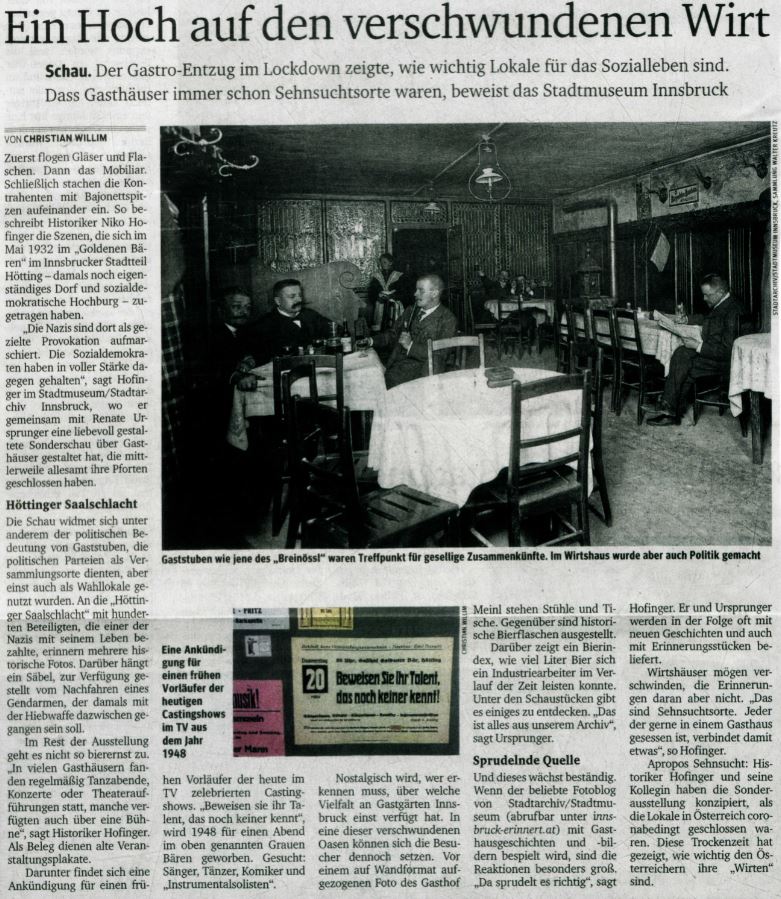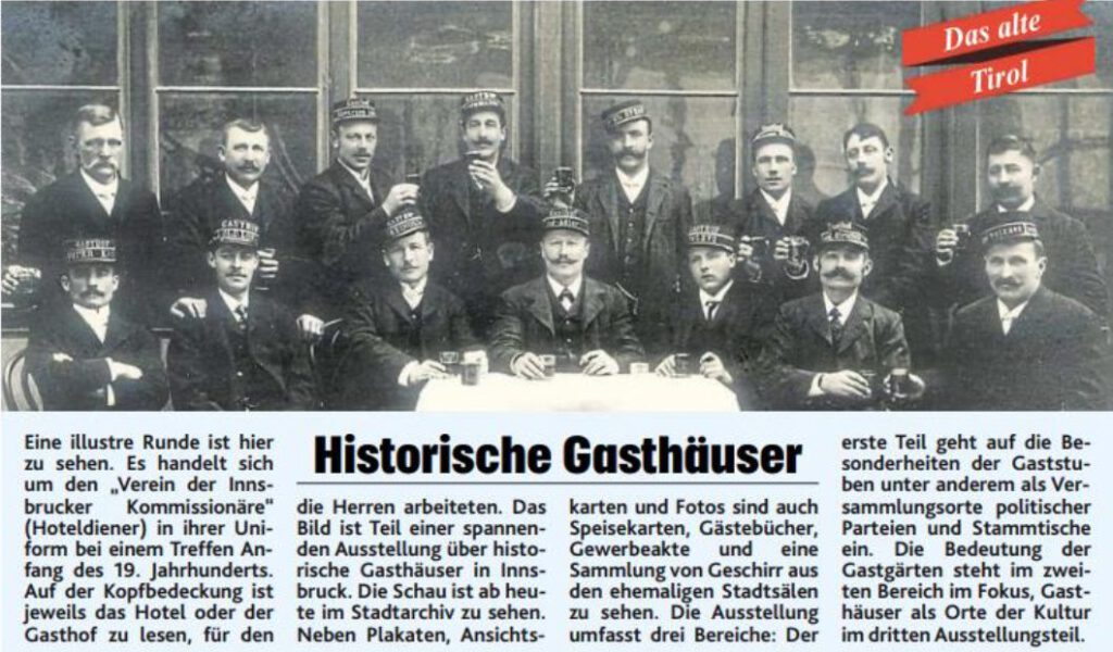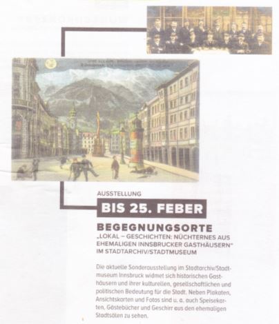 In den Lockdowns zeigte sich: Gasthäuser, Bars und Kaffeehäuser sind wichtige Orte der Kommunikation und der zwanglosen Begegnung. Sind sie geschlossen, fehlt uns etwas! Die Ausstellung war den historischen Gasthäusern Innsbrucks und deren Funktion gewidmet.