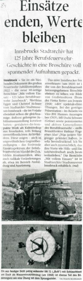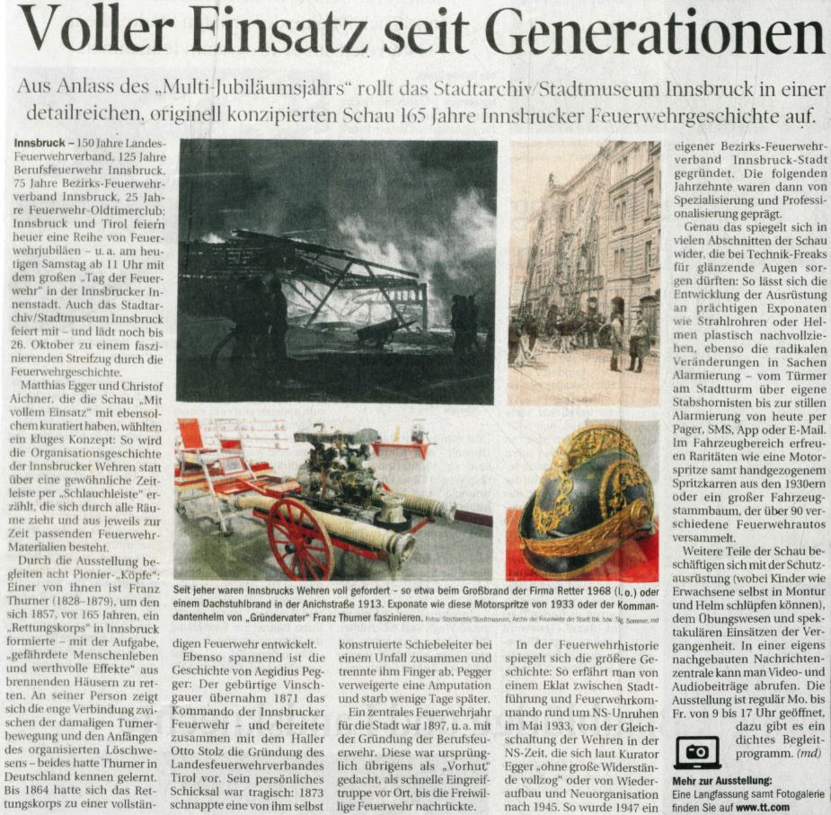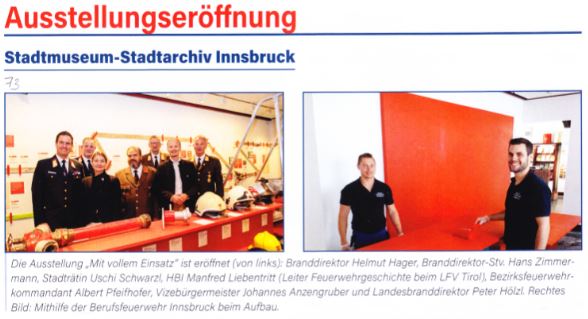 2022 ist für die Innsbrucker Feuerwehr ein ganz besonderes Jahr gewesen, gab es doch gleich mehrere Jubiläen zu feiern: 165 Jahre Feuerwehr Innsbruck, 125 Jahre Berufsfeuerwehr Innsbruck, 75 Jahre Bezirksfeuerwehrverband Innsbruck-Stadt und 25 Jahre Innsbrucker Feuerwehr Oldtimer Club. Aus diesem Anlass lud das Stadtarchiv/Stadtmuseum Innsbruck zu einem abwechslungsreichen Streifzug durch die Innsbrucker Feuerwehrgeschichte ein.